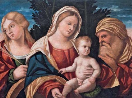 Lot 6 Francesco Rizzo da Santacroce attivo a Bergamo e Venezia dal 1508 al 1545 MADONNA CON BAMBINO, SAN GIUSEPPE E SANTA CATERINA D’ALESSANDRIA olio su tavola, cm 56,5 x 75,5. Si ringrazia il Professor Peter Humfrey per aver suggerito l’attribuzione dell’opera sulla base della documentazione fotografi ca.