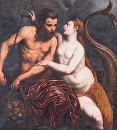 Lot 7 Paris Bordone Treviso 1500 – Venezia 1571 NETTUNO E ANFITRITE A CAVALLO DI UN MOSTRO MARINO, 1560-1565 CIRCA olio su tela, cm 106x99. Provenienza: Genova, Collezione privata; Vienna, Dorotheum, 15 ottobre 2013, lotto n. 566; Collezione privata. Esposizioni: Bitonto, Galleria Nazionale della Puglia, 15 dicembre 2012 – 8 aprile 2013, n. 1. Bibliografi a: K. und Reichsfi nanzaarchiv in Wien, Inventarium aller derjenigen sachen, so nach der victori n ihrer majestät schatz und kunstcamer zue Praag seind gefunden…den 6. Dezembris anno 1621…, ed. Zimmermann, 1904, [19421] p. XLII, n. 1029; A. Donati in N. Barbone Pugliese, A. Donati, L. Puppi (a cura di), Nettuno e Anfi trite in Tiziano, Bordon e gli Acquaviva d’Aragona: pittori veneziani in Puglia e fuoriusciti napoletani in Francia, Claudio Grenzi, Foggia 2012, n. 1, pp. 236-239; A. Donati, Paris Bordone. Catalogo ragionato, Edizioni dei Soncino, Soncino 2014, tav. LXXXIX, n. 139, p. 348 (ill.), p. 349 (cit.). Il dipinto ripropone due fi gure della mitologia greca, rispettivamente Anfi trite, fi glia di Nereo (la più bella tra le ninfe marine), e Nettuno, suo sposo. La ricercatezza e la rarità del soggetto consentono di ricondurre l’opera ad una raffi nata committenza genovese, in particolare a Ottaviano Grimaldi o Tommaso Marino, entrambi ricchissimi uomini d’affari, che scelsero di far decorare le proprie dimore con temi legati al commercio e ai mari. (cfr. A. Donati, op. cit., 2012, p. 236). Per il dipinto è possibile avanzare un’ipotesi di datazione intorno al 1560, al culmine dell’attività del pittore trevigiano: grazie ad una breve permanenza alla corte di Francesco II di Valois, compiuta tra il 1559 e il 1560, Paris Bordone conobbe alcuni dei committenti più prestigiosi della sua carriera, come il cardinale Carlo di Lorena per cui realizzò Giove ed Io (fi g. 2, 1559-60, olio su tela, cm 135,5x117,5; Museo di Göteborg) direttamente confrontabile per la resa delle due fi gure con il dipinto qui presentato. Altri confronti è agevole instaurare – tanto per stile quanto per datazione – con il Ratto di Proserpina (fi g. 1, 1560 circa, olio su tela, cm 137x124,3; Collezione privata), per la medesima resa pittorica ravvisabile nella scena, oltre all’affinità tematica, che suggerirebbe addirittura una committenza comune per i due dipinti (cfr. A. Donati, ibidem).