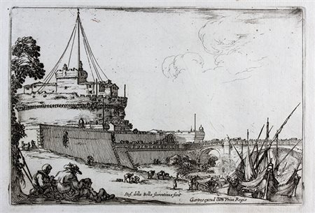 Acquaforte. mm 306x270. DVM, 832. Firmata e datata "SDBella f. MDCLVI" nel margine in basso a destra. Prima tavola della serie Sei grandi vedute, quattro di Roma e due della campagna romana. Bellissima prova nel II e definitivo stato dopo la comparsa della lettera, su sottile carta vergellata con contromarca "A.M".