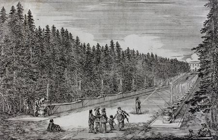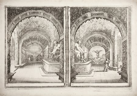 1) L’albero abitato. 2) Il viale delle fontane. 3) La grande scalinata. 4) Due diversi disegni d’una grotta sulla medesima lastra. 5) I getti d’acqua escono dal suolo. 6) Statua colossale dell’Appennino. Acquaforte. mm 243/257x370/385. Foglio: mm 325x440. DVM, 838-843. Serie completa ed omogenea in 6 tavole proveniente da Bernardo Sansone Sgrilli, Descrizione della regia villa, fontane, e fabbriche di Pratolino, pubblicato a Firenze presso la stamperia granducale nel 1742. Bellissime prove nello stato definitivo su carta vergellata bianca priva di filigrana. (6)
