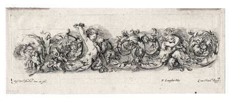 Acquaforte. mm 83x250. Foglio: mm 105x262. DVM, 998. Firmata in basso a sinistra, mentre a destra si legge l’iscrizione “N. Langlois Fils” con il privilegio ed il numero “12”. Dodicesima tavola da Ornamenti di fregi e fogliami, serie in 16 fogli in forma di fregio. SI AGGIUNGE: Id., Frontespizio de I principi del disegno. Acquaforte. mm 130x160. Foglio: mm 130x166. DVM, 364. Frontespizio della serie in 25 fogli numerati in basso, con il nome di Della Bella, il privilegio e, nelle prove più antiche, l'indirizzo di Mariette. (2)