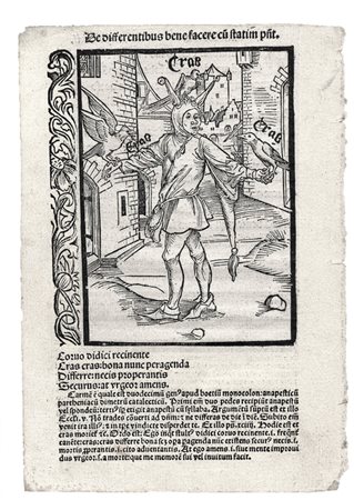 Xilografia. 116x85. Foglio: mm 185x130. Strauss, 13/c. Da Sebastian Brant (Strasburgo 1458 - 1521) Jodocus Badius Ascensius (Josse Badius Van Asche, Gand 1462 - Parigi 1535) Navis stultifera / a domino Sebastiano Brant primum edificata… Impressum Basilee per Nicolaum Lamparter, Anno. &c M.ccccc vii. Comparsa per la prima volta a Basilea nel 1494, in occasione del clamoroso Carnevale altorenano Das Narrenschiff (La nave dei folli) dell’umanista Sebastian Brant è un'opera satirica in tedesco alsaziano composta da una serie di 112 satire brevi, ed illustrata con xilografie, viene ricordata anche perché molte di esse furono eseguite da Albrecht Dürer, già attivo a Basilea negli anni precedenti. L’opera è un grottesco viaggio dei matti che, nella concezione di Brant, a cavallo tra tardo medioevo e rinascimento, sono tutt’uno con i peccatori, diretti verso il naufragio finale che precede la quaresima, metafora dell’eterna punizione. Il libro fu tradotto in latino da Jacob Locher (Stultifera navis) nel 1497, in francese da Paul Riviere nel 1497 e da Jehan Droyn nel 1498.