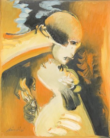 Lot 290 Remo Brindisi, Figure, 1980 Olio su tela, cm. 50x40 Firma in basso a sinistra. Certificato di autenticità a cura del Archivio Remo Brindisi al n. 3863. Certificato di autenticità a cura della Galleria Studio Aperto. Dichiarazione di autenticità a cura dell'artista sul retro. Etichetta della Galleria d'arte BluArt,Padova sul retro; etichetta del Catalogo Generale Remo Brindisi,Milano.