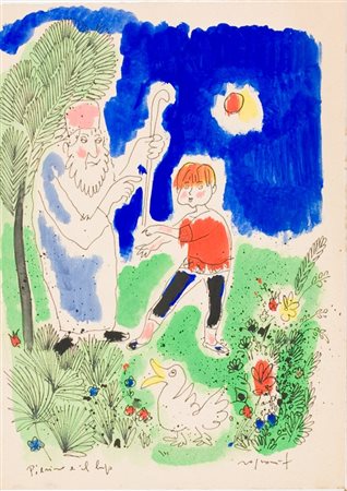 Lot 292 Franco Rognoni, Pierino e il lupo, Tecnica mista su carta intelata, cm. 34x24 Firma in basso a destra.