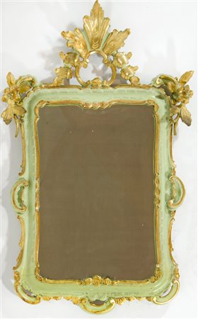 Lot 10 Specchio laccato e dorato lavorato a motivi floreali e cimasa scolpita. cm. 108x70.