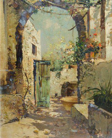 Lot 1 Pietro Lucano Trieste 1878-1972 "La scaletta" cm. 50x37 - olio su cartone Firmato alto a s. Al retro firma, titolo e numero 238.