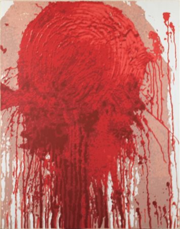 Lot 20 Hermann Nitsch (Vienna 1938) Senza Titolo 2001 Dim. 80X62 Serigrafia materica su cartone Opera senza cornice Autentica su foto dell’artista, nella foto lo stesso Artista firma l’opera Esemplare AP Esemplare in basso a sx Firmato in basso a dx