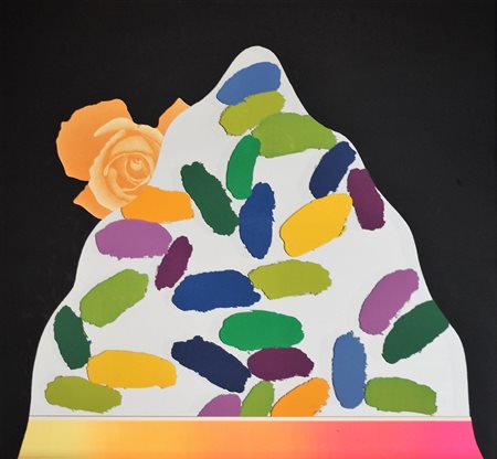 Lot 21 Concetto Pozzati (Vò 1935 - Bologna 2017) Lassù sulle montagne 1970 Dim. 65X75 Serigrafia su specchio Esemplare PS Timbro Pozzati Al verso titolo ed anno Tiratura in basso a sx Firmato in basso a dx