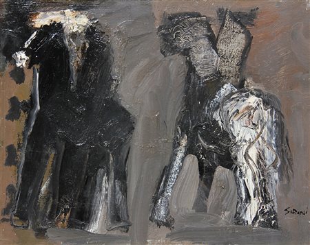 Lot 9 Mario SIRONI (Tempio Pausania 1885-05-12 Milano 1961-08-13) Cavalieri 1955 olio su tela cm. 40 x 50Firma "Sironi" (in basso a destra) Timbro della galleria Farsetti, Prato (al retro) Firma "Sironi" (in basso a destra) Timbro della galleria Farsetti, Prato (al retro) Lettera dell'Associazione per il patrocinio e la promozione della figura e dell'opera di Mario Sironi, con arch. n. 227/17 RA