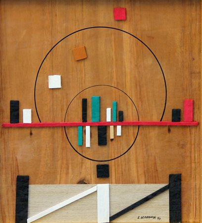 Lot 14 Luigi VERONESI (Milano 1908-05-28 Milano 1998-02-25) Legni colorati 1993 collage e tecnica mista su tavola cm. 56 x 51.5Firma, data "L. Veronesi, 93" (in basso a destra) Titolo, firma, data "Legni colorati, L. Veronesi, 93"; timbro della Galleria Schettini, Milano; etichetta della Galleria La Polena, Genova; timbro della Galleria d'Arte Maggiore, Roma (al retro) Firma, data "L. Veronesi, 93" (in basso a destra) Titolo, firma, data "Legni colorati, L. Veronesi, 93"; timbro della Galleria Schettini, Milano; etichetta della Galleria La Polena, Genova; timbro della Galleria d'Arte Maggiore, Roma (al retro) Autentica dell'artista su fotografia