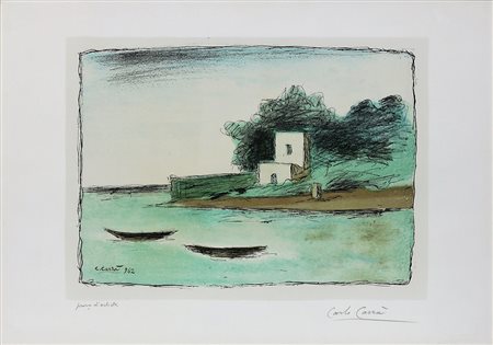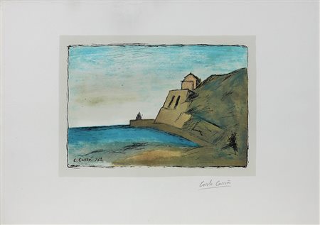 Lot 2 CARLO CARRA', Castiglioncello 107, Litografia Anno 1962 Dim. 44x62 Pubblicazioni in Carlo Carrà Opera Grafica 1922-1964, a cura di Massimo Carrà, Neri Pozza Editore, Vicenza 1976, n.107 Litografia a nove colori su zinco, cm 29,5 x 41,5 Firma incisa su lastra, in basso a destra. Tirata in 100 esemplari nel 1962, oltre a 15 esemplari di prova. Ritoccato a mano. Fa parte della seconda cartella “Carrà” pubblicata dalle Edizioni del Bisonte di Firenze nel 1962. Esemplare P.A. Timbro a secco in alto a dx Tiratura in basso a sx Datato e firmato in basso a sx Firmato in basso a dx