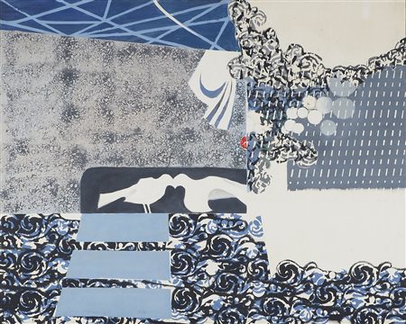 Lot 4 Paolo Conti 1938 "Composizione" cm. 32x34 - tecnica mista e spray Firma e titolo b. a d. Al retro timbro Studio d'arte G.R. Sacile.