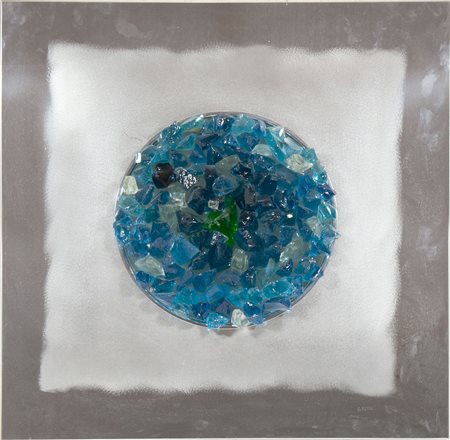 Lot 17 Angelo Brotto: grande applique in vetro azzurro di Murano su montatura in metallo cromato. tot cm. 80x80. Firmata in basso a destra.