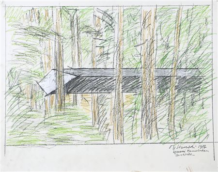Lot 24 Mauro Staccioli 1937-2018 "Composizione nel bosco" cm. 54x67 - tecnica mista su carta Firmato b. a d., datato 1987 e titolato.