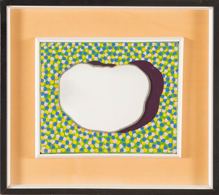 Lot 12 Olio con applicazione di specchio su tela, firmato e datato al retro Pozzati ‘67, al retro numero 3966/n-REG., H cm 20x25