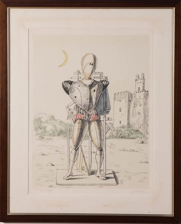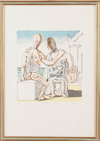 Lot 20 Litografia a colori, firmata in basso a destra G. De Chirico, titolata al centro ‘Il colloquio segreto’, numero di tiratura in basso a sinistra 46/99, timbri a secco ‘GdeC’ e ‘Alberto Caprini Stampatore in Roma’, Lastra H cm 37.5x34