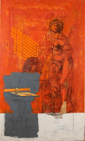Lot 22 Olio su tela, firmato, datato e titolato al retro ‘Lorenzo Tornabuoni Winckelmann/1977’, H cm 260x150Al retro reca etichetta parzialmente leggibile della Galleria Forni – Bologna. Opera accompagnata da certificato di autenticità su fotografia del gallerista Tiziano Forni con numero 3126 e firma dell’artista in data 1984.