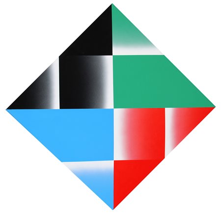 BIASI Alberto, Spezzato in rosso 1985 acrilico e tecnica mista su tavola, politipo cm. 50 x 50Firma, titolo, data, scritta, misure "A. Biasi, Spezzato in rosso, 1985, firmato sul retro della tavola, 50x50";