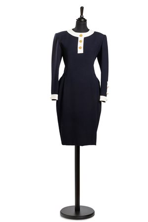 in lana color blu con rifiniture color bianco, decoro con tre bottoni gioielli di metallo dorato, tg 42 italiana -