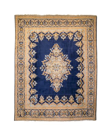 Lot 1 Tappeto orientale fondo blu - con medaglione fiorito centrale in forma di losanga ed ampia bordura nei medesimi toni cromatici del celeste e nocciola. cm 389x302