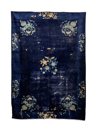 Lot 2 Tappeto cinese fondo blu - caratterizzato da composizioni floreali sparse nei toni del bianco e celeste. Consunto. cm 245x345