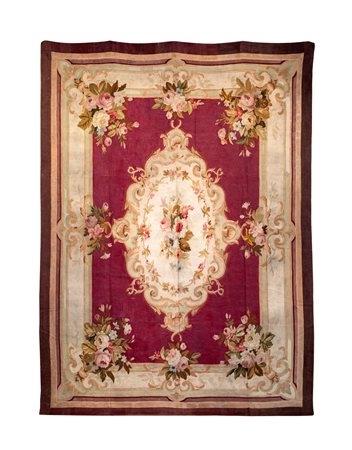 Lot 4 Tappeto Aubusson, Francia, fine del XVIII secolo - fondo rosso rubino, centrato da un grande medaglione ovale bianco centrato da un bouquet di rose; analoghe composizioni sono poste al centro di ogni lato e ai quattro angoli; ampia bordura fondo crema racchiusa da cornici rosa e vinaccia. cm 310x430