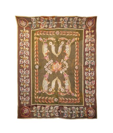 Lot 5 Tappeto Aubusson, Francia fine del XVIII secolo - fondo verde centrato da un fiore circondato da piccole corolle bianche da cui si dipartono quattro lunghi serti fogliacei nei toni del rosa racchiusi entro un lungo tralcio lineare con foglie binate; ampia cornice percorsa da motivi floreali. cm 290x370