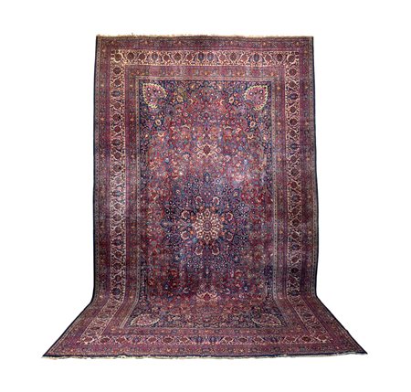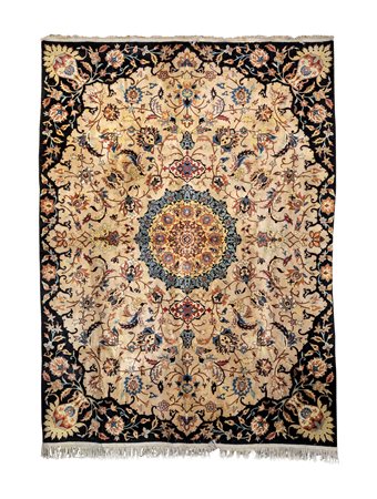 Lot 8 Tappeto Persiano Mashad - fondo chiaro con rosone centrale circondato da ampi tralci con foglie e fiori entro cornice dal profilo interno sagomato fondo blu. cm 280x380