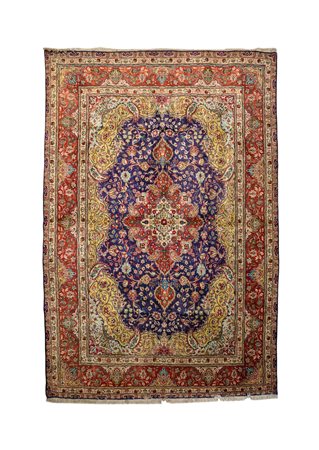 Lot 9 Tappeto persiano Tabriz - con medaglione blu centrato da rosone ruggine; fitto disegno naturalistico ripreso lungo le molteplici cornici. cm 362x244