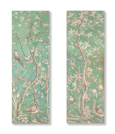 Lot 11 Coppia di pannelli decorativi, seconda metà del XVIII secolo - realizzati in seta fondo verde applicata su tavola, decorata a motivi naturalistici animati da figure di volatile en grisaille. cm 196x65