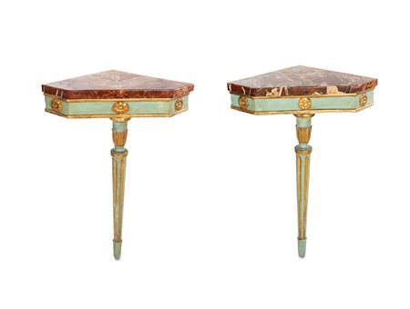 Lot 12 Coppia di consoles ad angolo in legno laccato verde. Italia centrale XVIII secolo - dorate lungo i profili ed i rilievi ornamentali; piano in marmo lastronato in diaspro rosso, sostegno frontale rastremato e scanalato. Difetti . cm 95x73x51