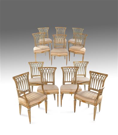 Lot 13 Coppia di poltrone e dieci sedie in legno laccato, Toscana, fine XVIII secolo. dorate lungo i profili ed i rilievi ornamentali; schienali a giorno di linea squadrata con archetti ad ogiva, sedili imbottiti, gambe rastremate. cm 90x58x45