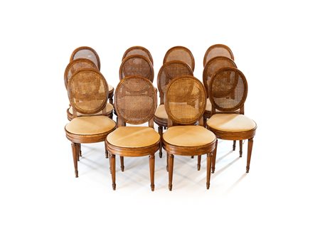 Lot 14 Dodici sedie in legno di noce, Piemonte XVIII secolo - con schienali arrotondati e sedili rivestiti in paglia di Vienna, gambe rastremate scanalate. cm 90x45x42
