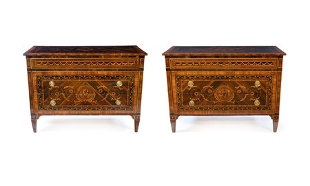 Lot 15 Coppia di cassettoni in noce, Lombardia, fine del XVIII secolo - intarsiati in legni di varie essenze; sul piano medaglioni con figure classiche circondati da ampie girali, elementi decorativi ripresi sulla facciata scandita da due cassetti privi di traversa sormontati da un lungo tiretto compreso nella fascia; maniglie ad anello in bronzo dorato, piedi rastremati. cm 93x129x59