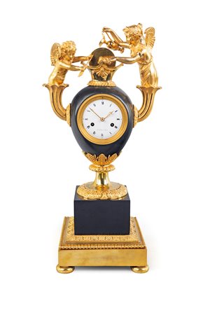 Lot 16 Orologio in bronzo dorato e marmo nero. a forma di vaso con anse ricurve da cui si ergono le figure di Amore che affila le frecce e di Psiche alata che gira la pietra versando sopra l'acqua da una brocca. Quadrante in smalto con numeri arabi dipinti, lancette dorate a fantasia, meccanica francese con scappamento ad ancora e sospensione a filo di seta, suoneria delle ore e mezze al passaggio su campanello; meccanismo firmato Le Sieur à Paris. cm 52x19x19