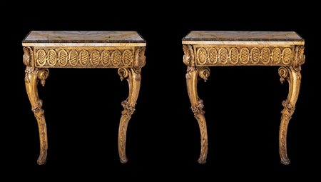 Lot 18 Coppia di consoles d'appliques in legno dorato, Italia centrale XVIII secolo - "con piani rettangolari lastronati in marmo giallo guarniti da ciglio in bronzo cesellato e dorato; fascia lineare percorsa da motivi a maglia circolare in rilievo su fondo inciso, gambe sagomate con attacchi a ricciolo e rilievi fogliacei alle estremità. Difetti. cm 90x75x35