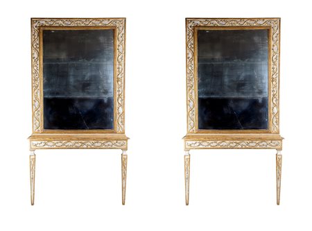 Lot 19 Coppia di consoles d'appliques con specchiera in legno laccato, fine del XVIII secolo - "con cornici lineari dorate lungo i profili ed i rilievi ornamentali in forma di tralci curvilinei intrecciati arricchiti da convolvoli; piano rettangolare in marmo giallo, gambe rastremate con attacco a rocchetto. Difetti. cm 270x133x35