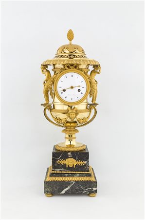 Lot 20 Grande orologio in bronzo dorato, Francia, epoca del Direttorio. cm 58x18x18 "in forma di vaso Medici impreziosito da fregi naturalistici di gusto neoclassico e caratterizzato da figure muliebri poste sulle anse; queste si dipartono dall'attaccatura del piede alla base del vaso guarnita da volto di Mercurio fra ghirlande minuziosamente cesellate. Coperchio a cupolino in parte traforato sormontato da una pigna, base squadrata in marmo abbellita frontalmente da mascherone. Movimento a doppio bariletto con sospensione di seta e campana realizzato dall'orologiaio parigino Sirost (come da firma sul quadrante), che aveva la sua attività in Rue Bertin-Poiré tra il 1806-1810 e successivamente in Rue des Fontaines nel 1840.