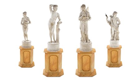 Lot 21 Quattro sculture neoclassiche in gesso - "raffiguranti Amore, Psiche, Apollo e Venere desunti dal repertorio classico; piedistalli in legno laccato ad imitazione del marmo giallo non coeve. Difetti e mancanze." altezza cm 103 - la base cm 60
