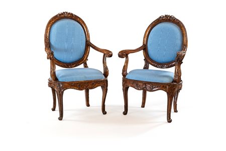 Lot 23 Coppia di poltrone in noce, Parma, seconda meta del XVIII secolo - con schienali ovali e sedili imbottiti rivestiti in tessuto azzurro; l'intera struttura è sottolineata da perlinatura minuziosamente intagliata, arricchita da rilievi vegetali e corolle; braccioli sagomati terminanti a ricciolo, gambe mosse. cm 108x72x47