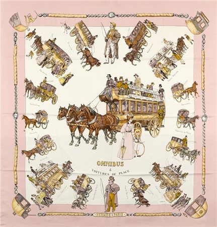 Foulard in seta "Omnibus et Voitures de Place" Philippe Ledoux 1967, fondo bianco bordo rosa pallido (segni d'uso) -