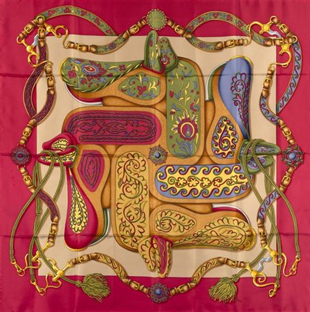 Foulard in seta "Paddock", Jean-Louis Clerc 1956, fondo rosso rubino (lievissimi difetti) -