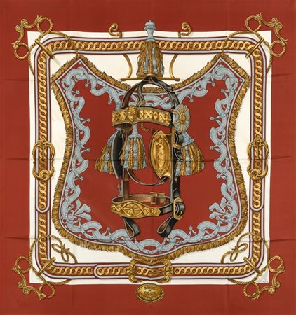 Foulard in seta "Brides de Cour", Françoise de la Perrière 1969, nei toni del ruggine e azzurro (segni d'uso) -