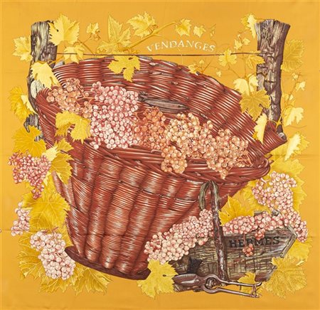 Foulard Hermès "Vendanges" Valerie Dawlat-Dumoulin 2001, fondo arancione pallido (lievissimi difetti) -