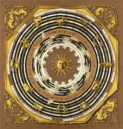 Foulard in seta "Dies et Hore", Françoise Faconnet 1963, fondo color marron glacée (lievi segni d'uso) -