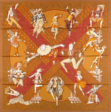 Foulard in seta "Les Ballets Russes", Annie Faivre 1996, nei toni del tabacco, ruggine, rosso e arancione -