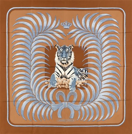 Foulard in seta "Tigre Royal", Christiane Vauzelles 1977 fondo e bordo nei toni del tabacco -