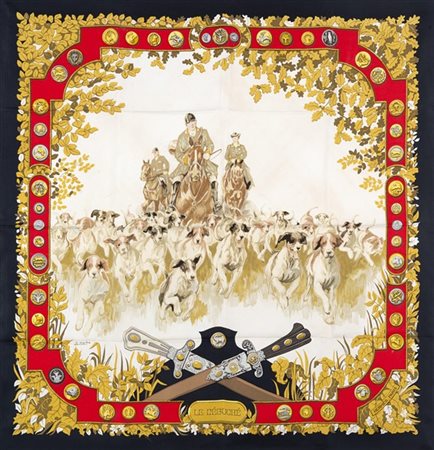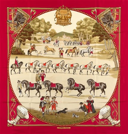 Foulard in seta "Presentation des Chevaux", Philippe Ledoux 1970, fondo beige pallido bordo rosso vivo (lievissimi difetti) -