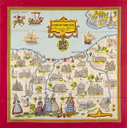 Raro foulard in seta "Chateaux Normands", Hugo Grygkar 1950, fondo avorio bordo color lampone (lievissimi difetti) -