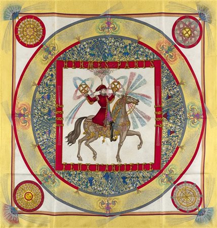 Foulard in seta "Gloria Soli", Joachim Metz 1994, fondo e bordo gialli (lievi segni d'uso)